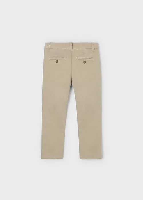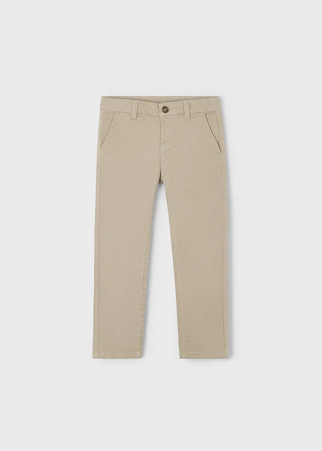 Pantalón largo para niño de tipo chino y corte ajustado (slim fit). Cierre con cremallera y botón. Goma elástica regulable con botones en el interior de la cinturilla para mayor ajuste. Cómodo tejido de sarga de gran resistencia. Diseño con múltiples bolsillos. Modelo perteneciente a nuestra colección Mayoral Basic, una prenda esencial en su armario para completar cualquier look. Por motivos de seguridad, las tallas pequeñas (2-5 años) no llevarán cremallera en la bragueta, sino que será simulada. Al elegir nuestros productos de algodón estás apoyando nuestra inversión en la iniciativa Better Cotton. El algodón Better Cotton se obtiene mediante un sistema de balance de masas y no se puede rastrear físicamente hasta los productos finales. Sin embargo, los productores de algodón se benefician de la demanda de Better Cotton en volúmenes equivalentes.