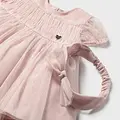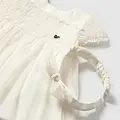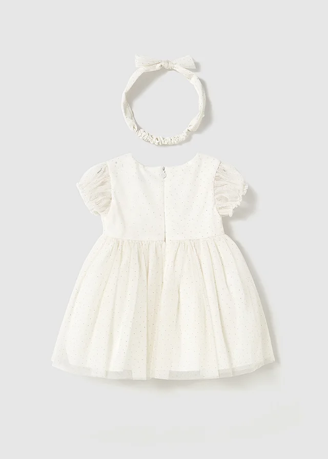 Vestido para bebé con diadema a juego. Vestido para bebé con mangas abullonadas. Cuello redondo. Cierre con cremallera trasera invisible. Confección en tejido de tul ligero y vaporoso. Suave forro interior de popelín. Este modelo lleva detalles de nido de abeja. Diseño con volante en el bajo de la prenda. Elementos de adorno: glitter. Bonita diadema tipo cinta de pelo para bebé. Podrás combinar este accesorio con todo tipo de looks. Elementos de adorno: lazo. Este exclusivo artículo pertenece a la colección de Ceremonia y ha sido diseñado para celebraciones, eventos y ocasiones especiales.